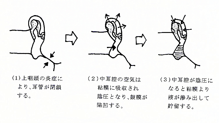 原因は鼻の奥の炎症や腫瘤が、まず耳管の狭窄を引き起こします。すると中耳腔の圧力の調整ができなくなり、中耳腔内の空気が吸収され、腔内の気圧が外耳道より下がっていきます。 鼓膜が内側(中耳腔側)に凹み、さらに中耳腔粘膜より液が滲み出し、貯留します。このため滲出性という名がついています。